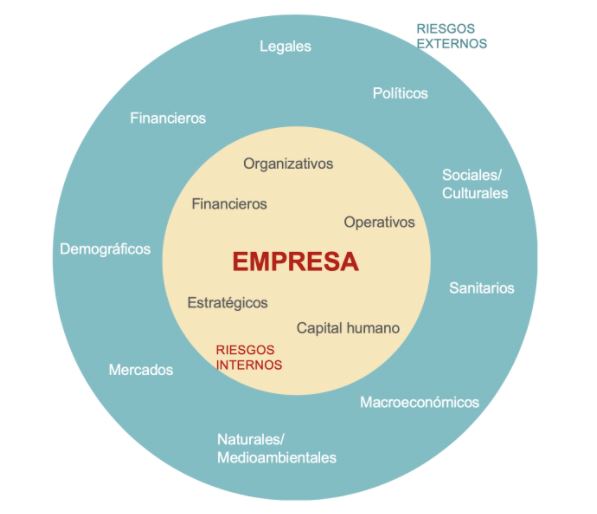 Los riesgos a los que se enfrenta toda empresa tienen dos posibles orígenes: factores externos o factores internos. Sobre los externos la empresa debe detectarlos para adaptarse/aprovechar los cambios que generan. Los internos sí puede gestionarlos porque dependen de su propia capacidad de gerencia, innovación, mejora…
